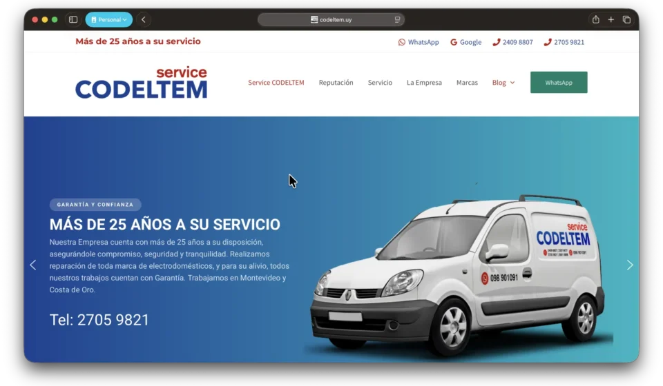 Nuestra Intervención: Diseñamos una estrategia de dominios diferenciados para atacar dos necesidades de búsqueda distintas. Por un lado, desarrollamos codeltem.com.uy, una infraestructura basada en subdominios y aterrizajes independientes optimizados para velocidad extrema y respuesta inmediata (SEO Local), facilitando que el usuario encuentre la solución a su problema específico en milisegundos. Por otro lado, codeltem.uy funciona como el pilar de confianza orgánica, donde se resalta la trayectoria y la garantía escrita de la empresa. Esta dualidad tecnológica permite captar tanto al cliente impulsivo que necesita una reparación urgente como al cliente corporativo que busca respaldo y seguridad.
